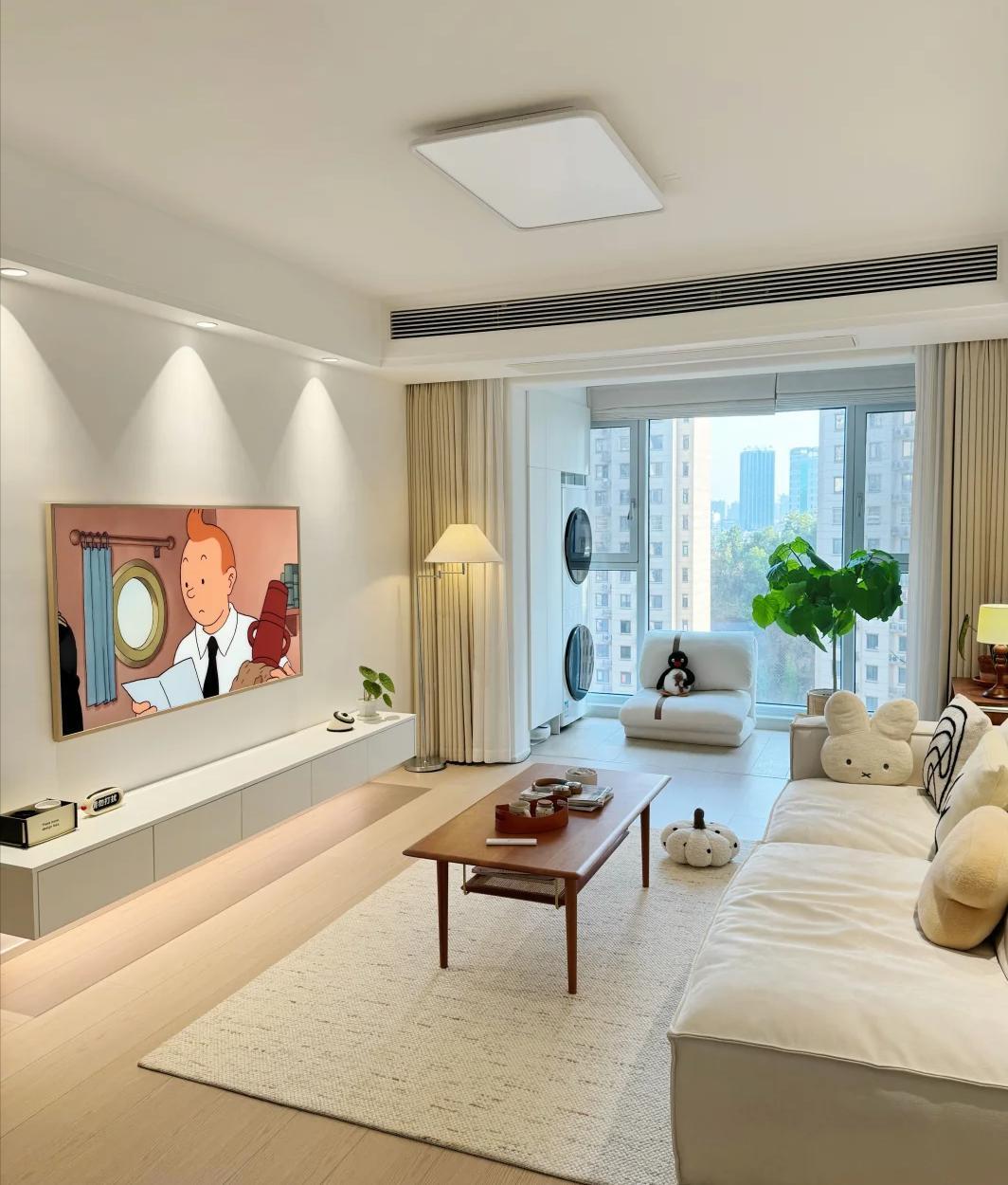 客厅以米白色为主调,辅以灰色沙发和原木茶几,简略妥当却不单调。沙发靠背上叠放着几条淡色绒毯,一看便是平经常窝着看剧的方位。