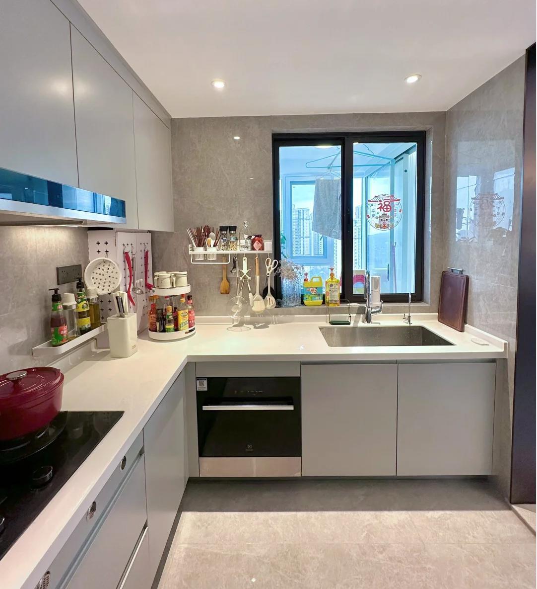橱柜是极简风的灰白配色,灶台上没有一点油渍,厨房台面也很整齐,摆放着一些常用的小电器,比方咖啡机、打蛋器,还有一只复古风的铜壶。看出来,她平常也挺爱折腾照料的。