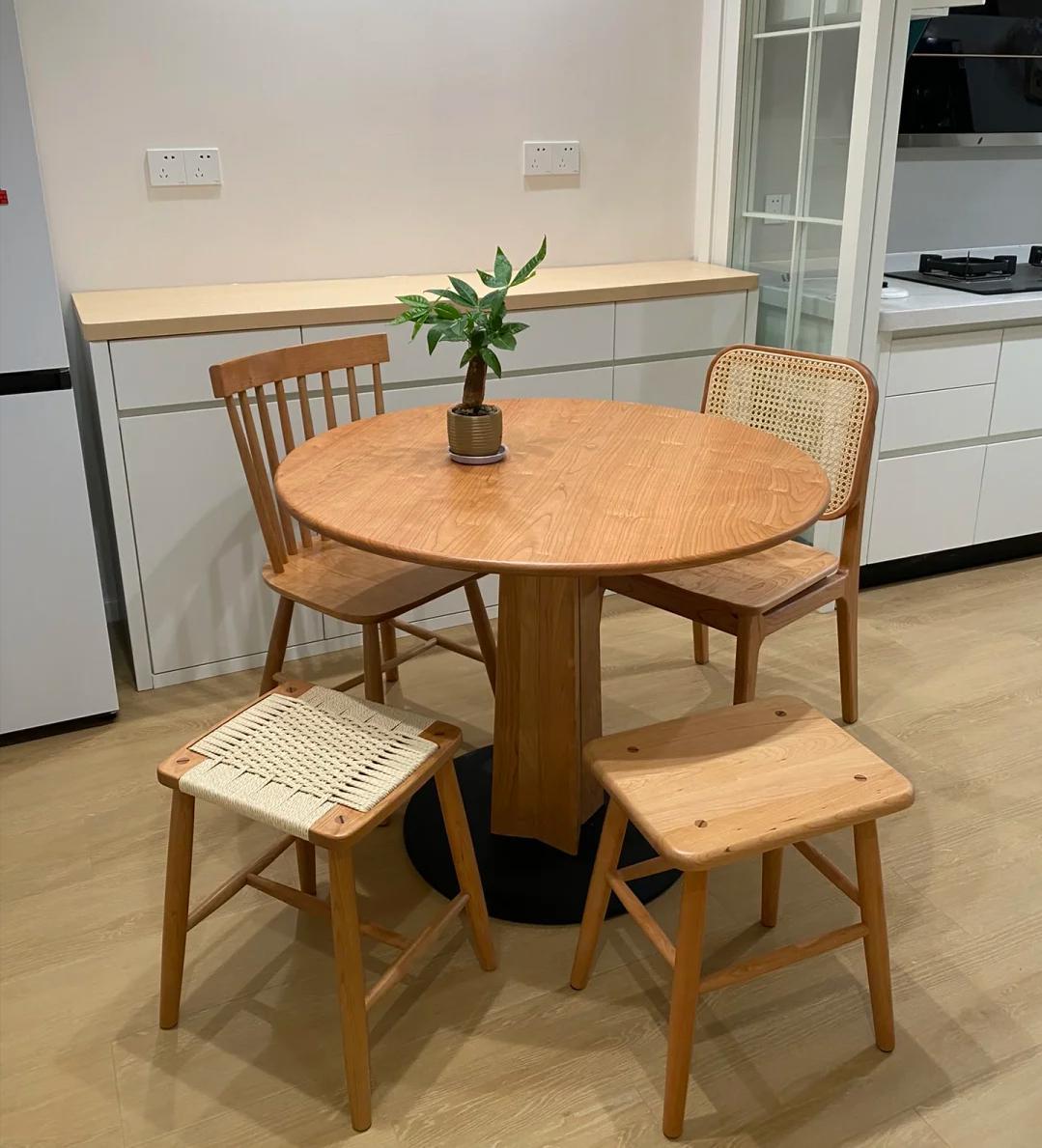 冰箱是双开门大容量的,门上贴着一些便当贴和食谱相片,有点日子碎片的温度。餐厅那一块用了原木原料的四人桌,餐椅是藤编靠背,清新天然。餐桌上摆着新鲜生果和一个干花花瓶,每一个细节都透露出“有人仔细在日子”。