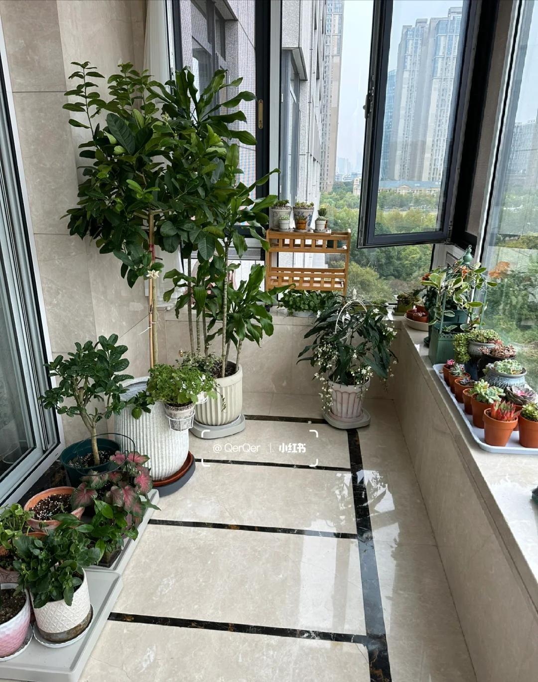 家中一角有个绿植区,不是那种密布摆满的“花卉墙”,而是几个盆栽错落有致地放在窗边,有绿萝、有富贵竹,还有一棵养得十分旺盛的琴叶榕,叶片油亮,明显打理得很用心。
