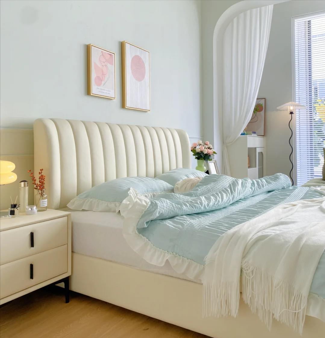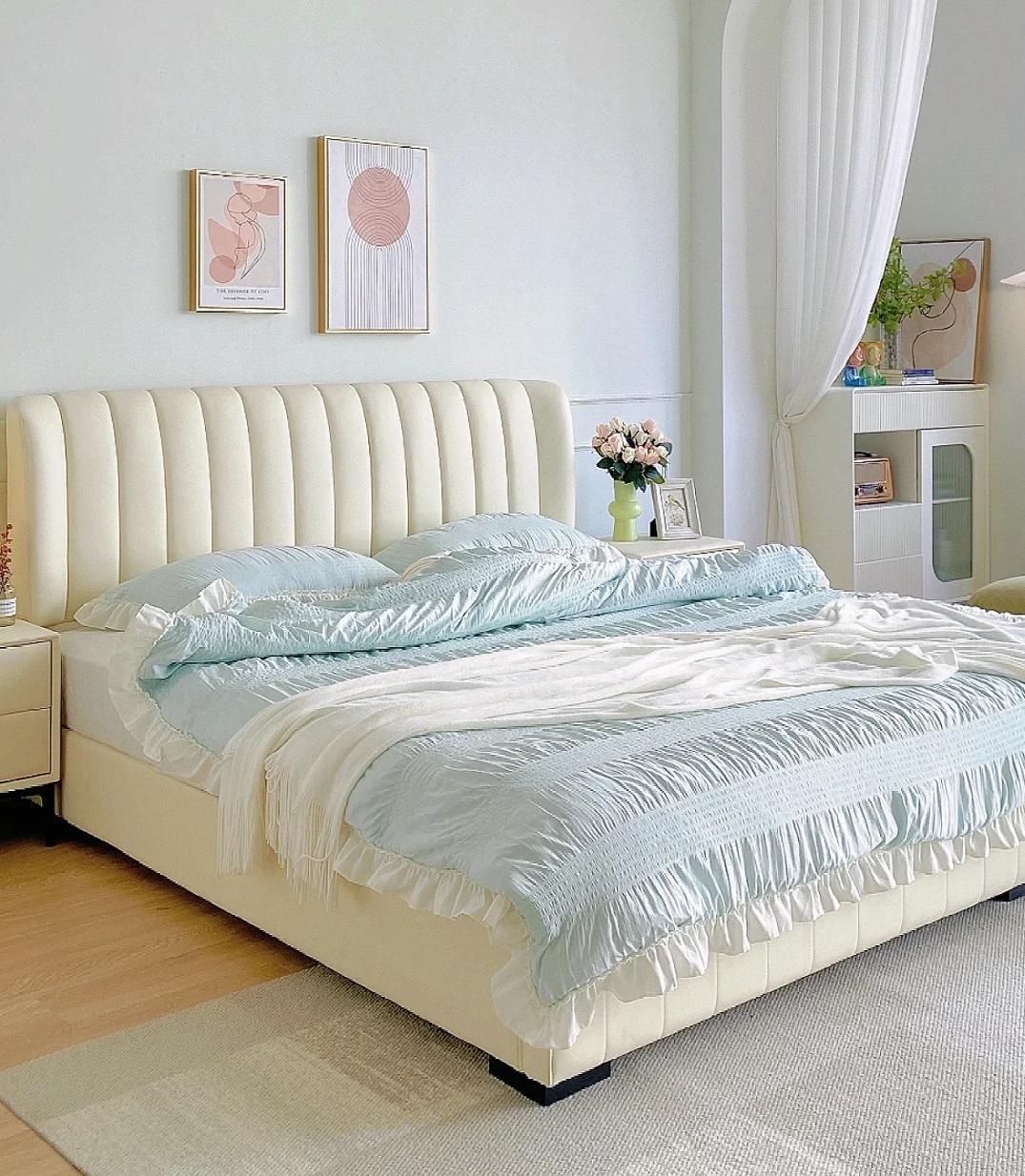 秦岚的卧室也曝光了一小角。床是大靠背规划,床品色彩偏柔软,有点奶油风,搭配着一盏带绒布灯罩的床头灯,睡前阅览肯定是她的习气之一。